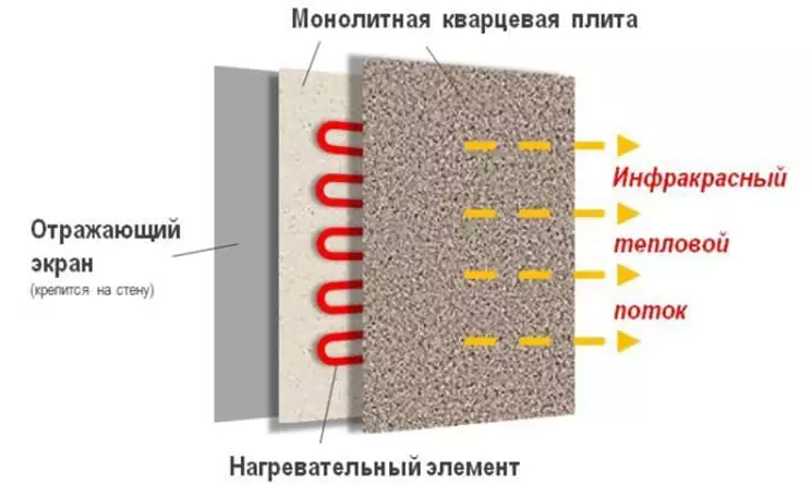 La température du panneau est augmentée par un élément chauffant en alliage nickel-chrome intégré. Le dégagement de chaleur se produit lorsque le courant traverse la spirale métallique. Son indicateur en état de fonctionnement est de 120°C. La dalle de quartz accumule de l'énergie thermique et la restitue même après déconnexion du réseau électrique. Les produits d'autres marques qui produisent des radiateurs monolithiques à quartz fonctionnent selon ce principe.