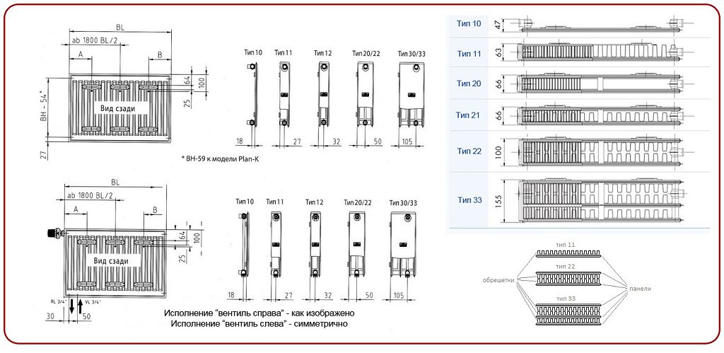 La profondeur du radiateur dépend directement du nombre de panneaux d'échange thermique. Cette caractéristique est indiquée dans le type de radiateurs. Outre les modèles design à l'aspect caractéristique, il existe les types de radiateurs chauffants à panneaux en acier suivants :