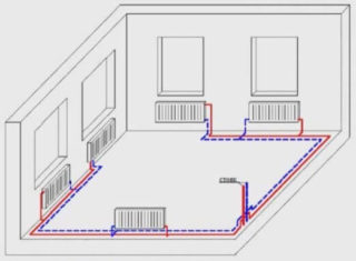 Un système avec un câblage inférieur implique le placement de tuyaux pour l'alimentation et l'évacuation de l'eau du fond des batteries. Dans ce cas, le mouvement du liquide de refroidissement change. Tout d'abord, il se déplace de bas en haut, pénètre dans les batteries et passe par le retour vers la chaudière de chauffage. Le circuit peut avoir plusieurs circuits, ainsi qu'un mouvement de fluide associé.
