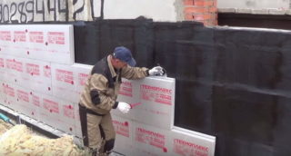 Il est recommandé d'isoler la fondation de l'extérieur. La surface est préalablement recouverte d'une couche d'imperméabilisation. Un mélange adhésif est appliqué sur les plaques de polystyrène expansé le long du périmètre et au centre. En l'appuyant sur le fond de teint, maintenez-le pendant 1 minute. Les feuilles sont empilées étroitement les unes aux autres, les rangées suivantes sont faites avec un décalage des coutures. Pour que la colle sèche, 2 jours sont donnés, puis l'isolant est fixé avec des chevilles en plastique. La finition finale est réalisée avec du mortier de plâtre sur le treillis d'armature.
