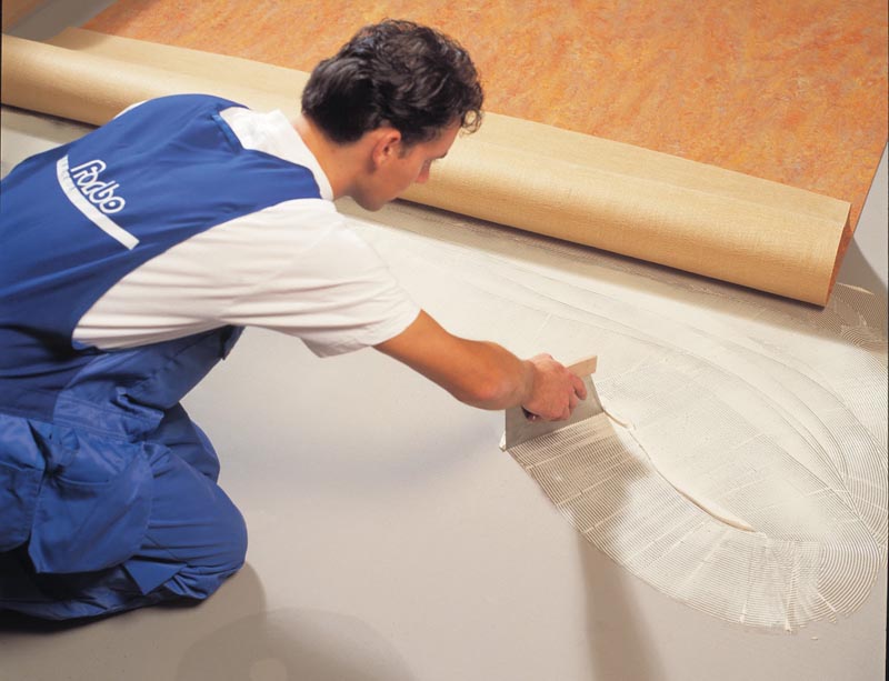 Avant l'installation, il est nécessaire de préparer la base: elle est nettoyée, réparée en réparant les fissures ou les éclats, le cas échéant. L'installation est effectuée à l'intérieur à des températures supérieures à 18 degrés Celsius. Une colle spéciale est utilisée pour la fixation. Il est nécessaire d'enduire le mauvais côté autour du périmètre et uniformément sur toute la largeur, cela assurera une adhérence maximale.