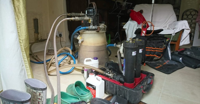 - Rincer avec le remplissage. Le système se remplit lorsque les vannes sont fermées. L'air est fourni sous pression pendant une période de 5 à 10 minutes. dans le tuyau d'admission, tandis que la sortie est fermée. Après la fin de l'alimentation en air comprimé, le rinçage est vidangé avec la saleté et le tartre.