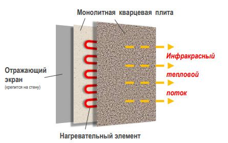 Le panneau de quartz-kaolin dégage de la chaleur dans la pièce grâce aux ondes infrarouges. La circulation de l'air est assurée par l'effet de convection. L'air froid, se réchauffant près du panneau chaud, monte. La circulation continue tant que l'élément chauffant en quartz est connecté au secteur.