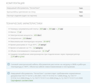 Teploeko produit des convecteurs de deux séries en versions claires et noires. La puissance est de 380 W, ce qui est suffisant pour maintenir une température confortable hors saison lorsque le système de chauffage principal n'est pas allumé. Permet de maintenir la température à 18 degrés dans des pièces d'une superficie de 15 m2.