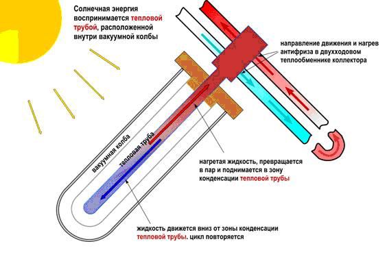 Dans les systèmes sous vide, la chaleur du soleil est transférée par un mélange gazeux spécial. Cela réduit l'indicateur d'inertie - le chauffage de l'eau à travers l'échangeur de chaleur est beaucoup plus rapide que pour les modèles liquides