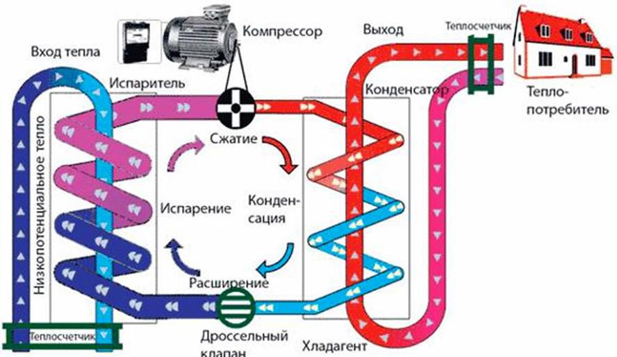 - Contour moyen. Dans celui-ci, à l'aide d'un échangeur de chaleur, l'énergie de l'eau chauffée (au moins 10-12 ° C) est transférée au réfrigérant. Après compression dans le compresseur, sa température monte à 65-70°C ;