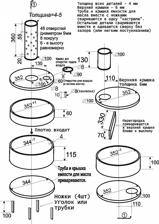 Un petit compresseur est nécessaire pour fournir de l'air. Le tuyau de celui-ci est installé dans le tuyau de dérivation situé à côté du réservoir d'huile usée. Pour l'allumage, un élément piézoélectrique ou un dispositif similaire est installé.