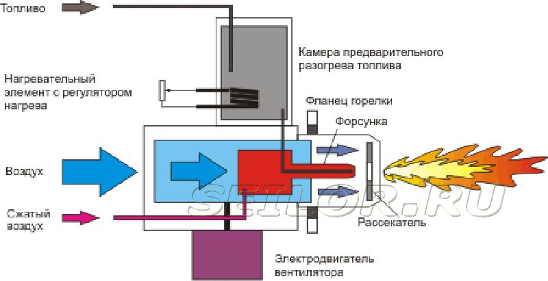Par conséquent, de nombreuses chaudières de chauffage au fioul usagé sont en fait au diesel. Leur principe d'obtention d'énergie thermique est similaire à celui d'un moteur de voiture. À l'aide d'une pompe, le carburant est fourni à la buse avec une injection simultanée d'une grande quantité d'air. Ce mélange s'enflamme, générant une grande quantité d'énergie thermique.