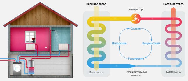 - Contour intérieur... Un schéma similaire est utilisé pour transférer la chaleur du réfrigérant comprimé à l'eau dans le système de dépassement. Ainsi, le chauffage des entrailles de la terre se fait à un coût minime.