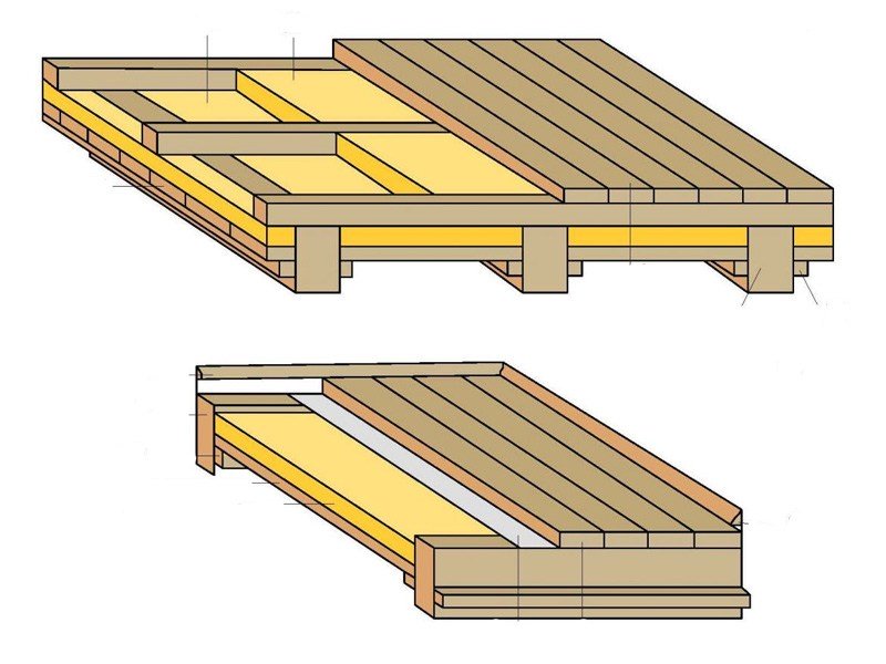 Une fois la surface préparée, nettoyée des débris, un sol rugueux est organisé. Ils prennent des blocs de bois, des vis autotaraudeuses, montent la caisse avec un pas de 0,4 à 0,5 m, remplissent des planches d'une largeur de 200 mm sur le dessus.