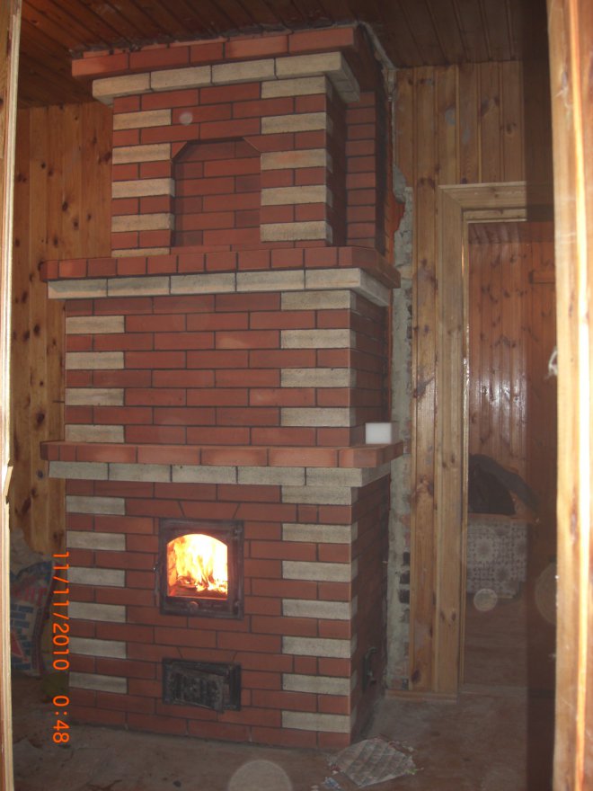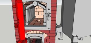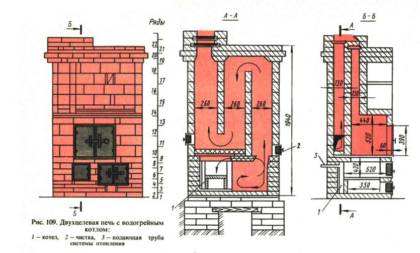 Les rangées 13 et 14 sont le plafond de la chambre de chauffe, elles sont donc en matériau résistant au feu. Les rangs 15 à 17 complètent l'équipement de la chambre de chauffe. Au 17e rang, plusieurs autres trous sont percés avec des portes pour le nettoyage. La rangée suivante se termine par la surface horizontale du four. À partir du 20e rang, une cheminée commence à apparaître, qui est construite dans l'ordre avec des ponts horizontaux aux joints et se termine au 30e rang. La paroi supérieure de la fournaise, chevauchant le conduit de fumées, est réalisée sur la 38ème rangée de maçonnerie, un volet de fumée y est également installé.
