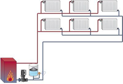 Un tel chauffage à deux tuyaux d'une maison à deux étages vous permet de monter une chaudière dans le grenier et d'installer des sols chauds dans la maison. Un tel système de chauffage garantit qu'il fera chaud n'importe où dans votre maison et, si nécessaire, vous pouvez toujours éteindre n'importe quel radiateur en cas de réparation ou à d'autres fins.