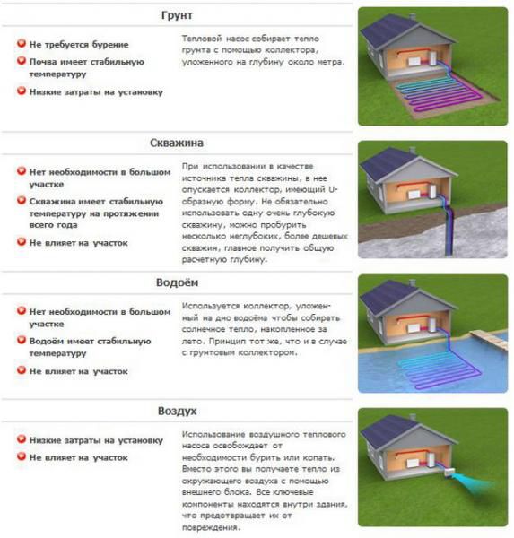 La tâche la plus importante dans la conception du chauffage d'une maison à l'aide d'une pompe à chaleur est le choix d'un fluide pour chauffer le liquide de refroidissement dans le circuit primaire. Il existe plusieurs types d'équipements de chauffage de ce type, capables de s'adapter à différents supports chauffants.