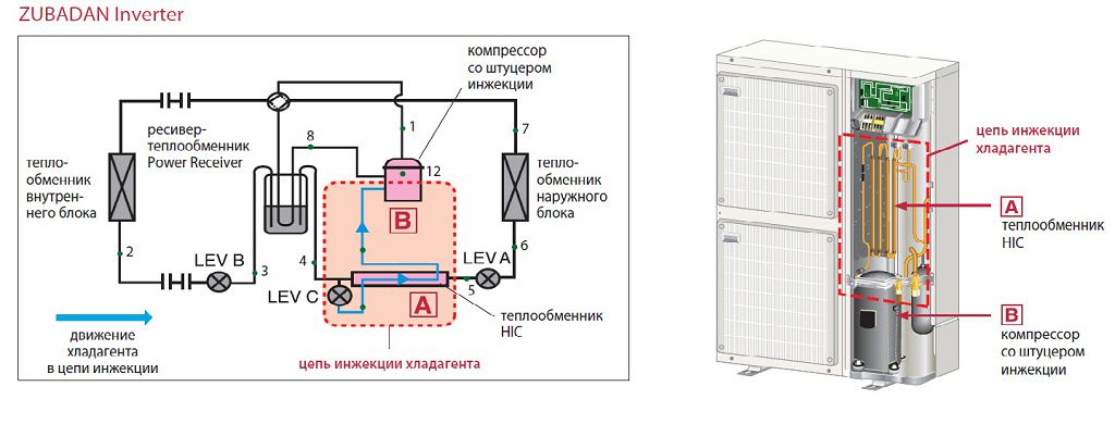 Mais est-il possible de faire fonctionner ce chauffage dans des régions où les températures sont basses en hiver ? Pour ce faire, il est nécessaire d'effectuer le chauffage à l'aide d'une pompe à chaleur avec un module supplémentaire - une ligne d'injection.