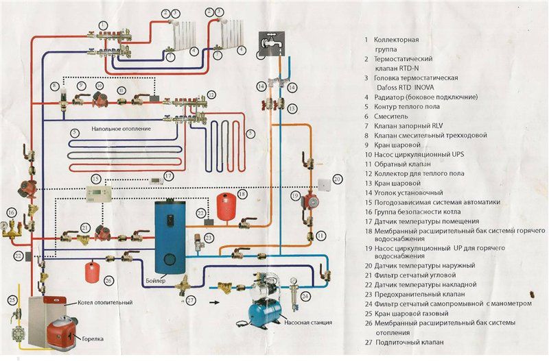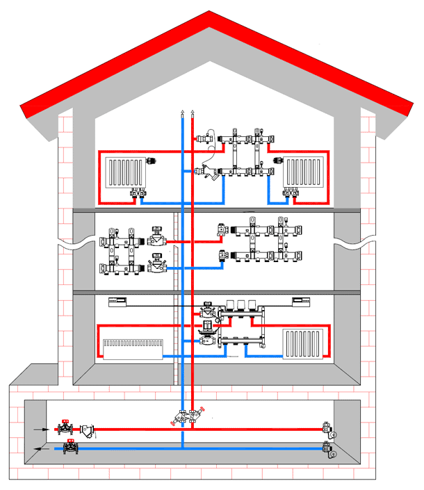 Le schéma traditionnel de chauffage par collecteur d'une maison à deux étages comprend des nœuds de distribution aux premier et deuxième niveaux. Mais tout dépend de la superficie totale des locaux et, par conséquent, de la longueur des autoroutes individuelles.