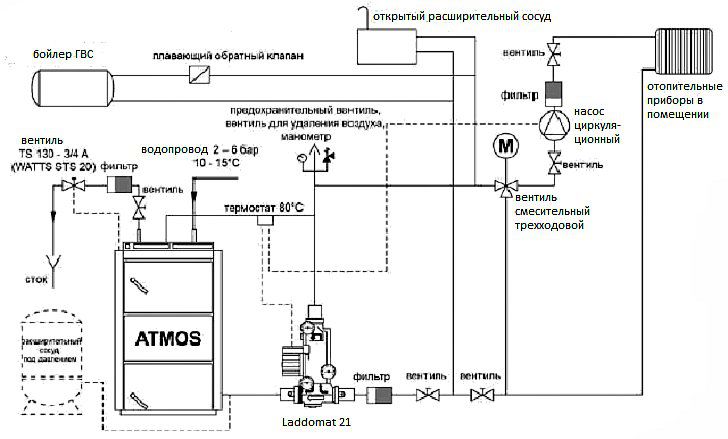 Le schéma classique d'une chaudière pour chauffer une maison privée au bois comprend une chambre de combustion, un collecteur de cendres et une cheminée. Ceux. ce n'est pas différent du four. Il est beaucoup plus pratique d'utiliser des chaudières à vapeur avec du bois à combustion longue.