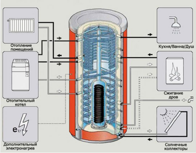 Le réservoir de stockage est structurellement presque complètement similaire à une chaudière classique. La différence réside dans la tuyauterie interne qui se connecte au système de chauffage. Dans ce cas, il est nécessaire de résoudre la question - pourquoi avez-vous besoin d'une chaudière dans le système de chauffage?