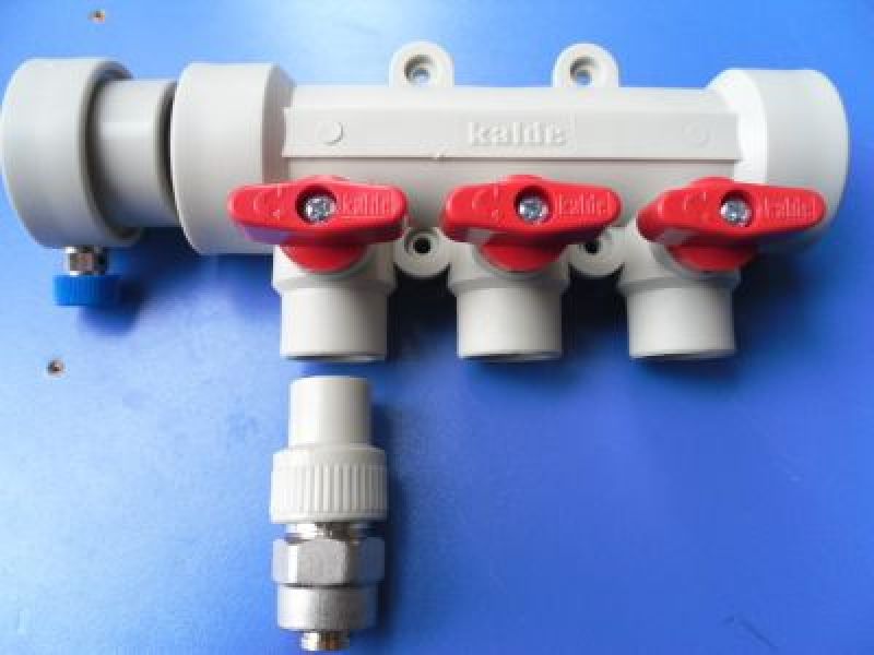Pour la fabrication du corps, il est recommandé d'utiliser un tuyau avec une pression nominale maximale d'au moins PN20. Selon un schéma pré-calculé, toutes les buses nécessaires y sont installées - entrée et distribution. Pour le contrôle, des vannes d'arrêt et de régulation sont installées dans la distribution du chauffage par collecteur en plastique. Il peut être des types suivants :