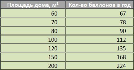 Pour déterminer la pertinence de l'utilisation d'une méthode de stockage de gaz par ballon, il est recommandé d'utiliser les données du tableau indiquant le rapport de la superficie de la maison à la consommation moyenne de propane en bouteilles de 50 litres.