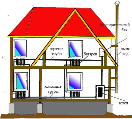 Le système de circulation naturelle prévoit la pente des tuyaux qui traversent toutes les pièces, sous le plafond, contre les murs. Lors de l'installation du chauffage de l'eau dans une maison à un étage, un tel système peut toujours être utilisé. Mais lors de l'installation du chauffage de l'eau dans une maison à deux étages, il sera très difficile de calculer la pente des tuyaux. Par conséquent, lors de la planification du chauffage de l'eau pour une maison de campagne, il est préférable de gérer la circulation forcée. Elle est réalisée à l'aide d'une pompe circulaire. Le principal inconvénient est que s'il y a une panne de courant, l'eau dans les tuyaux s'arrêtera. Mais ce problème ne concerne que les propriétaires de chaudières à combustible solide. Si chauffage de l'eau d'une maison de campagne sera réalisée au gaz ou à l'électricité, n'hésitez pas à installer la pompe.