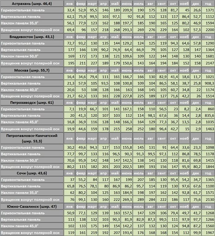 De plus, un système de chauffage solaire passif peut modifier son efficacité en raison de l'angle d'inclinaison du panneau. Cela dépend aussi de la saison. Pour déterminer l'énergie théoriquement possible, vous pouvez utiliser les données du tableau.