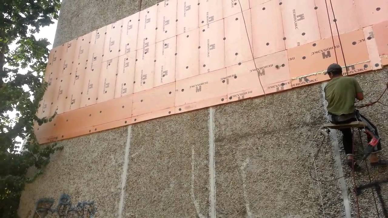 La pose commence de bas en haut, si nécessaire, un limiteur est placé en bas, mis en niveau. Étalez le mélange adhésif uniformément sous la feuille avec un mouvement de rotation. Une autre façon consiste à appliquer l'isolant, en déplaçant quelques centimètres sur le côté, puis, en appuyant légèrement sur la feuille, déplacez-la au bon endroit. Jusqu'à ce que le mélange de colle ait séché, les feuilles sont fixées avec des chevilles parapluie en plastique avec un marteau et un perforateur.