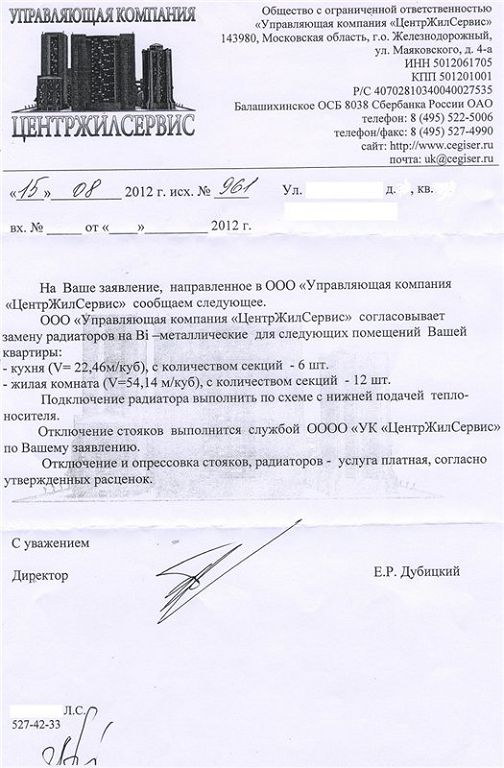 Pour ce faire, vous devez d'abord vous mettre d'accord avec les voisins, car l'ensemble du réseau de chauffage est considéré comme une propriété commune. C'est pourquoi il est nécessaire d'obtenir le consentement pour déconnecter la colonne montante de tous les utilisateurs. Le document correspondant avec signatures est prévu par le Code pénal.