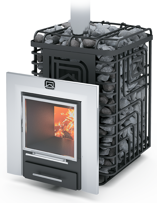 - Le rayonnement infrarouge des parois extérieures de la chambre de combustion est complètement absorbé par les pierres, et un convecteur perforé spécial fournit un chauffage rapide record du hammam en seulement 50 minutes.