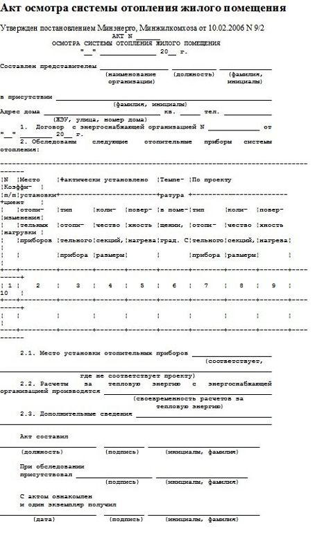 L'établissement du rapport d'inspection du système de chauffage du bâtiment est effectué uniquement par des représentants de l'entreprise responsable. Cela prend en compte les spécificités de l'approvisionnement en chaleur, son type et son état actuel. Lors de l'inspection du système de chauffage du bâtiment, les points suivants du document doivent être remplis :