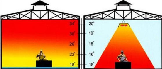Il s'agit principalement de chauffage ponctuel. Sa différence avec la traditionnelle réside dans la répartition de la chaleur dans un certain volume de la pièce, et non sur toute sa surface. Cela s'applique au chauffage des entrepôts, où il est nécessaire de créer un régime thermique individuel dans des zones séparées.