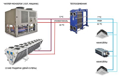 Ce type d'approvisionnement en chaleur se compose de deux éléments - un refroidisseur et des unités francoil installées dans le bâtiment. Le premier n'est pas monté à l'intérieur de la maison, mais sur son toit. Le refroidisseur est basé sur le principe d'une pompe à chaleur. Dans son premier circuit circule un fluide frigorigène dont la température augmente avec l'augmentation de la pression. L'énergie reçue est transférée via l'échangeur de chaleur au circuit interne, qui est connecté au secteur à l'aide de canalisations. Ils sont à leur tour liés aux francoils.