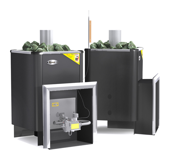 - Les chaudières de sauna sont installées dans le hammam de manière à ce que la face avant soit tournée vers le dressing. Pour ce faire, une fenêtre est réalisée dans le mur entre le hammam et le dressing, correspondant à la taille du brûleur.