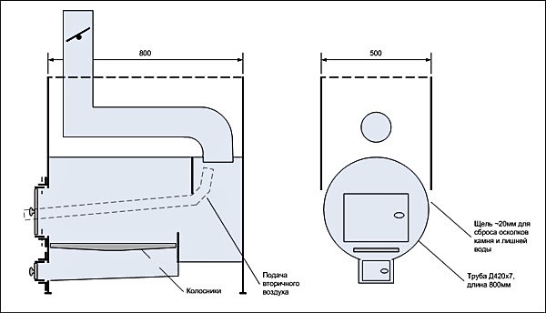 Une grande accumulation de suie à l'intérieur d'un four horizontal peut l'enflammer. Une postcombustion sous la forme de deux tubes métalliques pliés vers le tuyau, installée sur l'une des parois de la structure, aidera à résoudre le problème. En conséquence, la quantité de suie diminuera et le four sera mieux saturé en oxygène, ce qui entraînera une combustion complète du bois de chauffage.