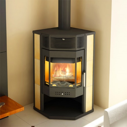 - Coin. C'est le type de poêle le plus populaire et le plus original pour les chalets d'été. Il est situé dans un coin et semble très attrayant lorsqu'il est correctement installé. Une cheminée d'angle prend peu de place dans la pièce et complète l'intérieur si l'ouverture du poêle est orientée selon l'axe de l'angle formé par les murs. Auparavant, des parois inclinées de la chambre à fumée étaient utilisées dans de tels types, mais au fil du temps, la version à deux chambres est devenue populaire. Plus d'espace extérieur est nécessaire pour les décorations et autres solutions. La cheminée est montée dans l'un des murs de la pièce. La partie extérieure de la cheminée est faite de métal, de béton et d'autres blocs. La finition se fait avec de la brique, du plâtre ou de la pierre spéciale.
