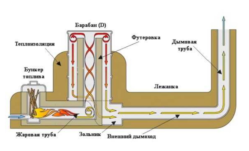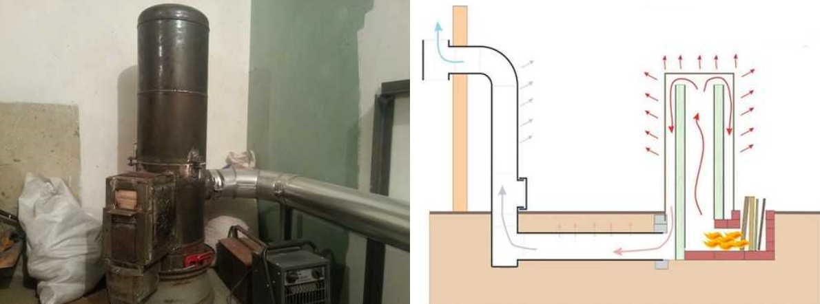 Le schéma classique montre les caractéristiques d'un réchaud à jet. Dans cette conception, le carburant est chargé verticalement. La flamme est formée dans une section horizontale. Avec une alimentation en air suffisamment forte, le jet de gaz chauffés se déploie rapidement par la paroi de la chambre principale. Cela provoque un effet de vortex dans la partie centrale (riser), augmentant la poussée. Les murs sont chauffés dans les canaux latéraux. La chaleur résiduelle s'accumule dans le revêtement du tuyau de sortie relié à la cheminée. Cette partie est traditionnellement créée sous la forme d'un banc de poêle.