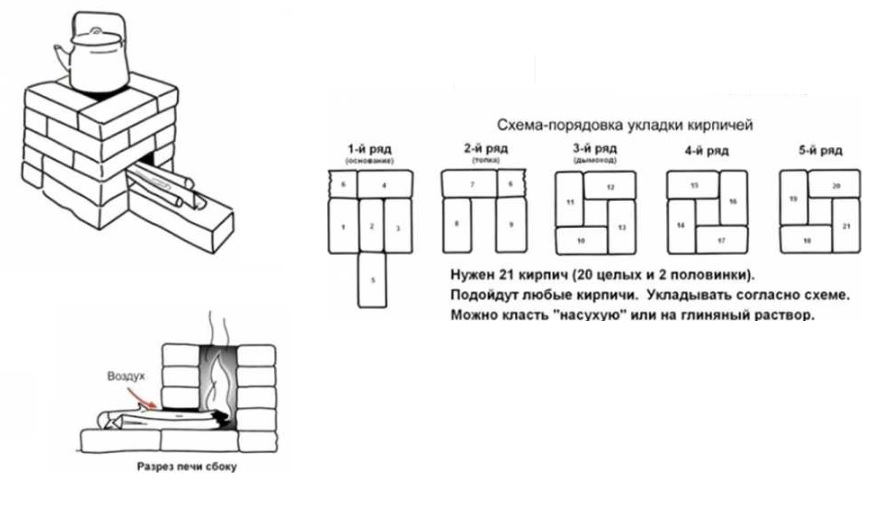 Contrairement à un feu de camp, cette conception retient la chaleur pendant longtemps. Les ustensiles de cuisine peuvent être placés dans l'ouverture étroite. Pour plus de commodité, un support spécialisé est utilisé - un treillis composé de tiges d'acier ou de fonte. Même dans cette version la plus simple, une température élevée est créée dans la zone de travail, ce qui contribue à la combustion complète du carburant avec une génération de fumée minimale.