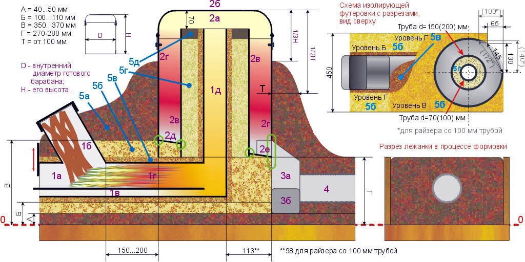 Il est recommandé d'isoler la chambre intérieure. Des parois suffisamment épaisses permettront d'assurer la montée en température jusqu'à + 950C ° et plus. Cela est nécessaire pour une reproduction de haute qualité du processus technologique. Avec un tel chauffage, une combustion complète du combustible avec une quantité minimale de cendres est assurée.