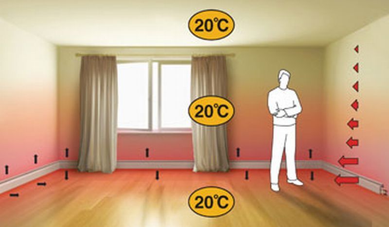 - chauffage uniforme de la pièce sur toute sa surface et température de l'air stable à la fois près du sol et sous le plafond;