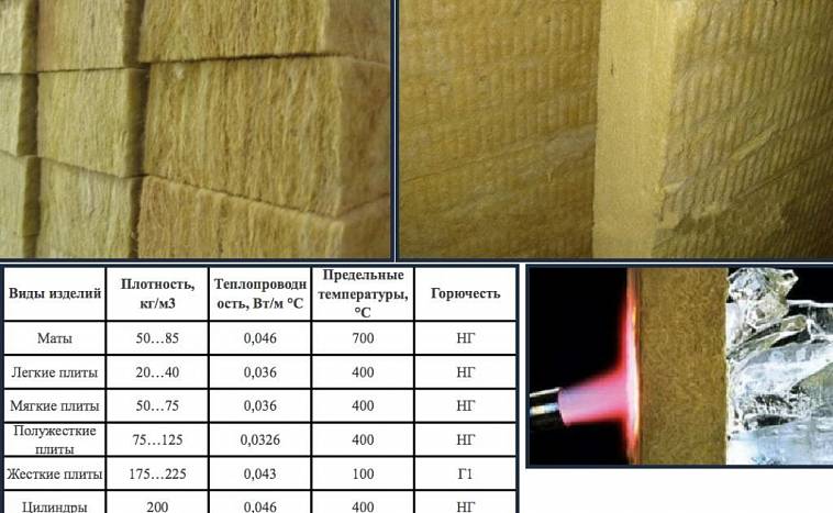 | Vues | Densité, kg / mètre cube | Conductivité thermique, W / m * С | Températures limites, С | Inflammabilité |