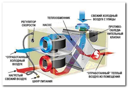 La structure se compose d'une chaudière de chauffage, d'un ventilateur et d'un système de conduits qui traverse toutes les pièces. Après refroidissement, l'air chaud passe à travers les filtres, pénètre dans le radiateur et est à nouveau fourni aux pièces. Un serpentin électrique, un circuit de gaz ou d'eau est utilisé comme réchauffeur. Pour garder l'air frais, il est constamment pris dans la rue.