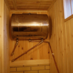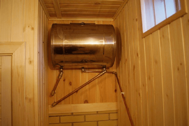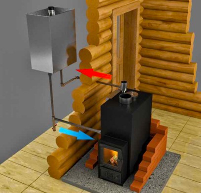 Dans le passé, de tels réservoirs d'eau chaude étaient installés dans des salles de bain déjà en cours de construction. Lorsque la partie inférieure du réservoir était connectée à la chambre de combustion, le liquide était chauffé à partir de la chaleur du four. L'avantage de cette conception est la vitesse de chauffe élevée. L'inconvénient est une diminution du transfert de chaleur de l'unité de four aux masses d'air (puisque la majeure partie va à la préparation du liquide). L'eau est prélevée du récipient avec une pelle ou un robinet est installé. La capacité du réservoir résultant est déterminée par la taille du four.