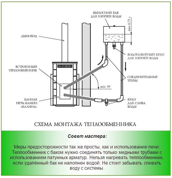 La commodité de connecter un réservoir distant à un poêle de sauna est la possibilité de choisir parmi plusieurs emplacements pour le conteneur. Habituellement, il est placé dans la salle de douche à côté du hammam. Un élément d'échange thermique intégré dans le four est chargé de chauffer le liquide. Il est relié au réservoir au moyen de tuyaux en laiton ou en cuivre. Le liquide froid traverse l'échangeur de chaleur et le retour est déjà chauffé.