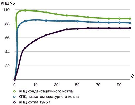 Comme vous pouvez le voir sur les données du graphique, il n'y a pas de différence significative lorsque la chaudière fonctionne en mode normal. La différence d'efficacité pour les chaudières à gaz ne se produit qu'au moment du démarrage jusqu'à ce que le régime de température requis soit atteint (50-70 ° C).Ensuite, il y a une stabilisation du travail et un indicateur de performance. Mais pour améliorer ce dernier, vous pouvez suivre les étapes suivantes :