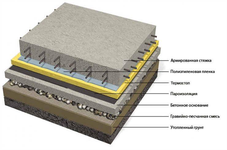 - Traitement de la dalle avec un antiseptique et un apprêt. Pose d'isolant dur (au moins 10 cm).