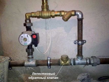 Dans les systèmes à plusieurs circuits, une vanne d'arrêt pour le flux inverse doit être installée, car lorsque la pompe est éteinte, le vecteur d'énergie se déplace le long d'une petite branche. Le mécanisme est également monté en ligne avec un chauffe-eau à chauffage indirect, surtout s'il n'y a pas de pompe séparée.