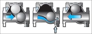 Le mécanisme d'obturation est réalisé sous la forme d'une bille en aluminium ou en d'autres métaux. L'élément est recouvert de caoutchouc pour une durée de vie plus longue. La bille monte lorsque le débit d'eau se déplace dans le bon sens et se situe en haut de la vanne. Le porteur d'énergie ne s'écoule pas dans la direction opposée, puisque l'élément descend et bouche le trou.