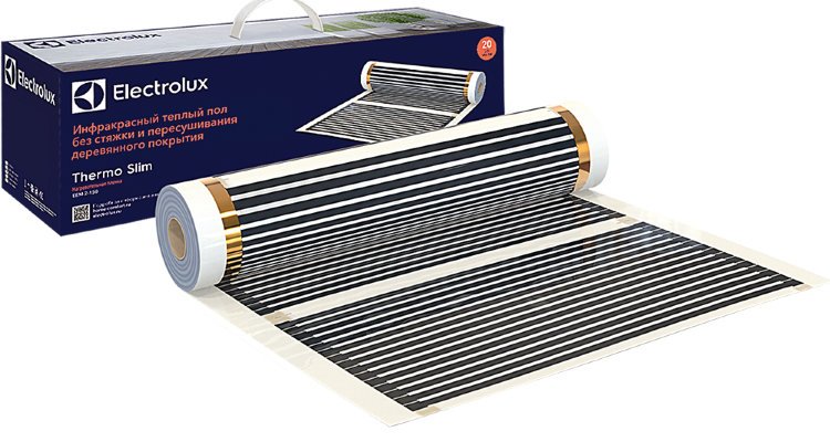 Ensemble d'un film de sol infrarouge Electrolux ETS 220-7. Il est placé sous différents revêtements et redistribue la chaleur tout au long de l'année. Posé sans l'utilisation de matériaux humides (colle et mortier). Il est interdit de travailler dans des pièces très humides.