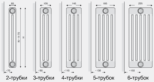 Le nombre de tuyaux dépend du type de modèle. Habituellement, dans une section, il y en a de 2 à 60. Avec une augmentation du nombre de tubes, la profondeur de la batterie augmente et sa largeur diminue, tout en conservant tous les indicateurs de transfert de chaleur. Le paramètre de dimension est particulièrement important pour les pièces de petite surface.