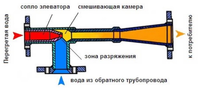 La pression interne dans la conduite de chauffage ne permet pas à l'eau surchauffée de se transformer en vapeur. Lors de la transmission en raison des pertes, la température du milieu diminue, mais de manière insignifiante, la question de l'obtention du liquide de refroidissement de la température de fonctionnement ne résout pas. Pour résoudre le problème, un ascenseur chauffant est utilisé, dans lequel le liquide de refroidissement surchauffé de la chaufferie est dilué avec un liquide refroidi provenant de la canalisation de retour.