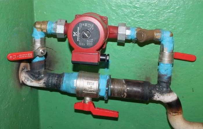 Ce schéma de connexion est utilisé dans les systèmes de chauffage autonomes pour les maisons privées. Il permet au mécanisme de l'unité de fonctionner normalement avec une pression insuffisante dans le réseau de chauffage (moins de 2 bars entre l'entrée et le retour).